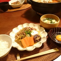 おはようございます(ノ´▽`)ノ昨日の晩ごはんは、すき焼きでした。ご飯ですよぉ♪家庭料理毎日ウチゴハン牛肉の切り落としを使っておいて、すき焼きと言うのも、おこがましいので、すき焼き風ってことで。(^▽^;)生卵も用意しました。ぎやまんの漆に生卵。(*^.^*)なんだか可