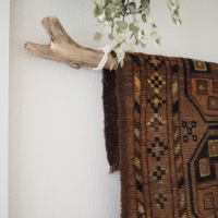 おはようございます!少し前からトライバルラグにハマっているわたし。お気に入りのラグを、ニンジャピンで壁に飾っていました。だけど、このラグ、何かバーのようなものに掛けて飾るとかっこいいだろうなぁ思っていたのです。最初に思いついたのは、真鍮製のタオルハンガー
