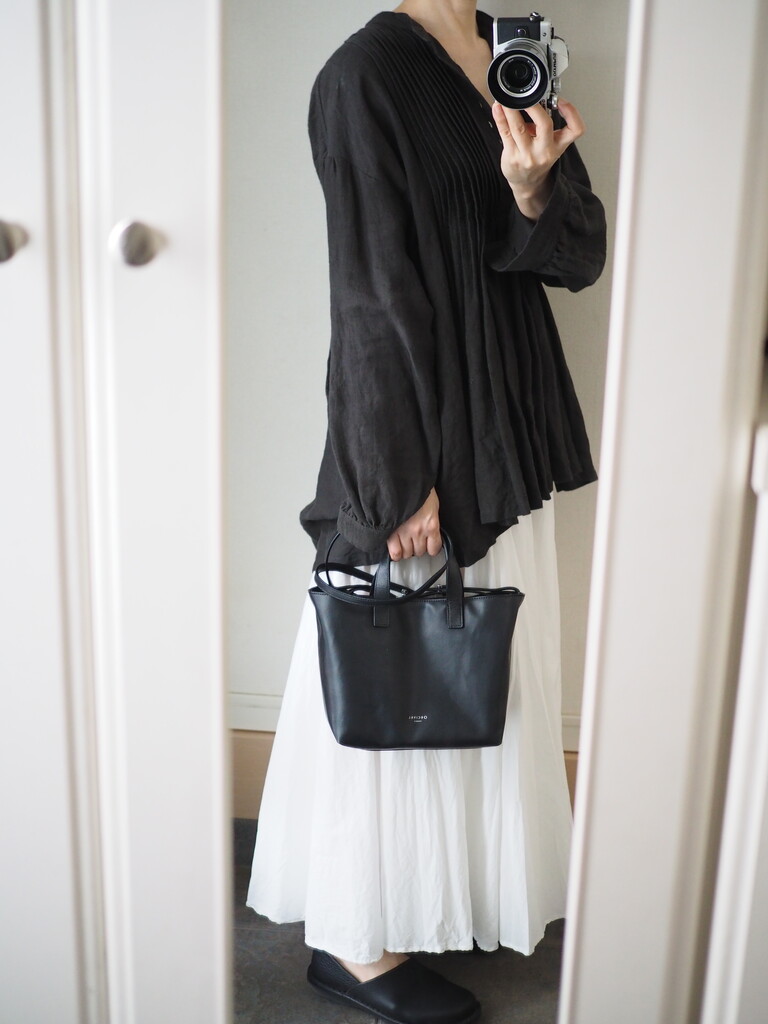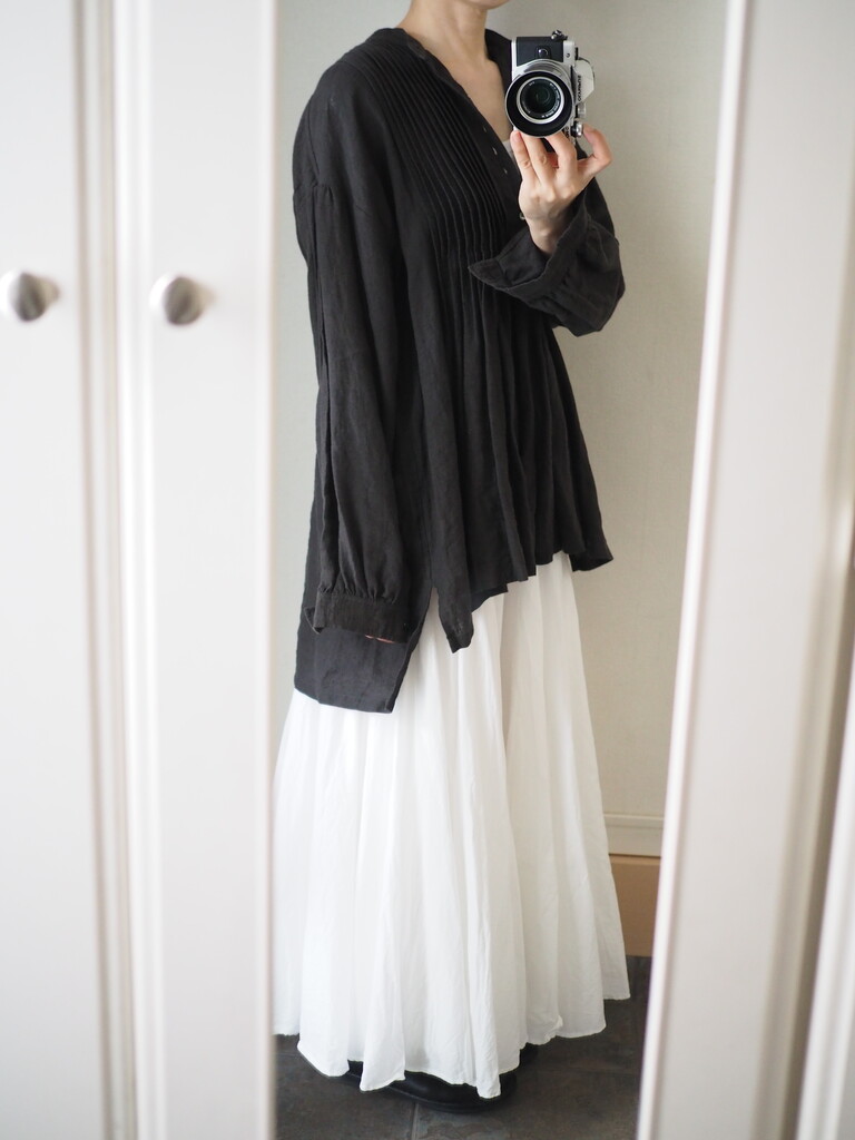 ブラックのタックリネンブラウスを合わせて