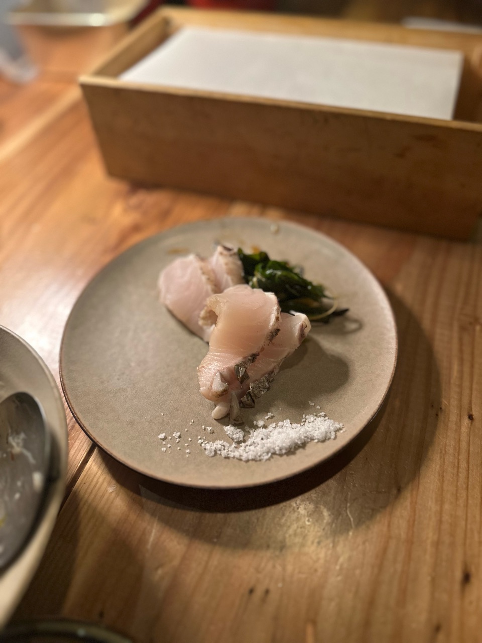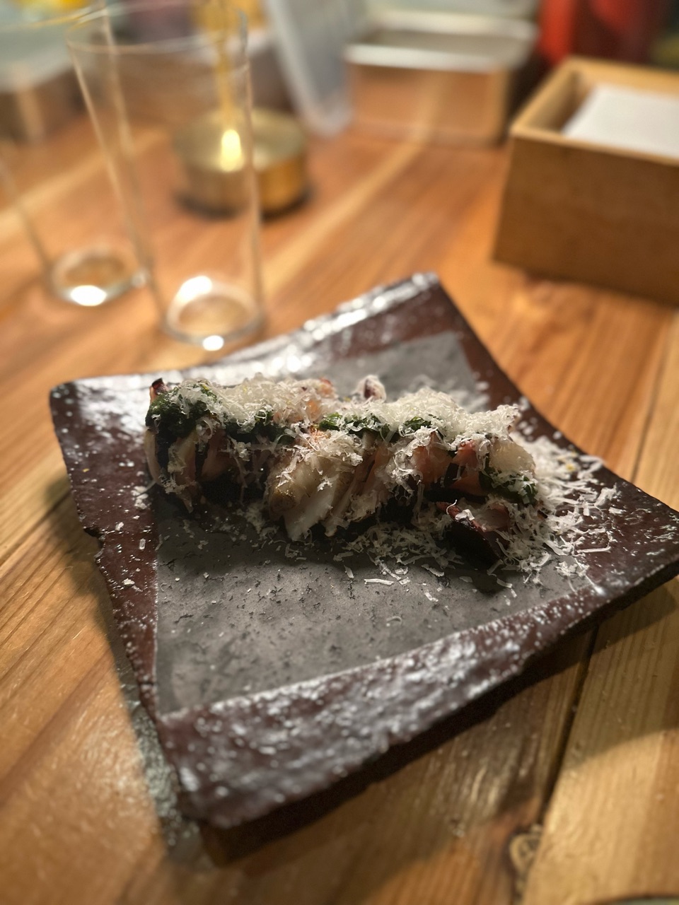 これ、多分、小松菜を薪火でざっと炙ったものを