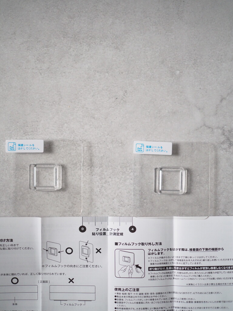 付属のフィルムフックを平らな壁面に取り付けて